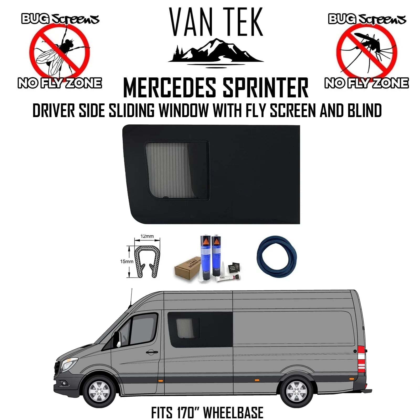BRAND NEW 2025 Mercedes Sprinter Sliding Window With Built In Internal Horizontal Fly Screen and BLIND SYSTEM. Keeps the insects out and gives privacy at night