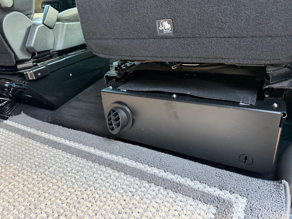 Here at AVC RIG we have installed hundreds of gasoline furnaces in our camper van builds; nothing beats having that heat while camping in cold climates. Program your heater in the daily driver to turn on an hour before driving the kids to school? You can do that too. The Transit Seat Base Heater Trim gives you the CLEANEST under-seat installation possible in a Ford Transit van.